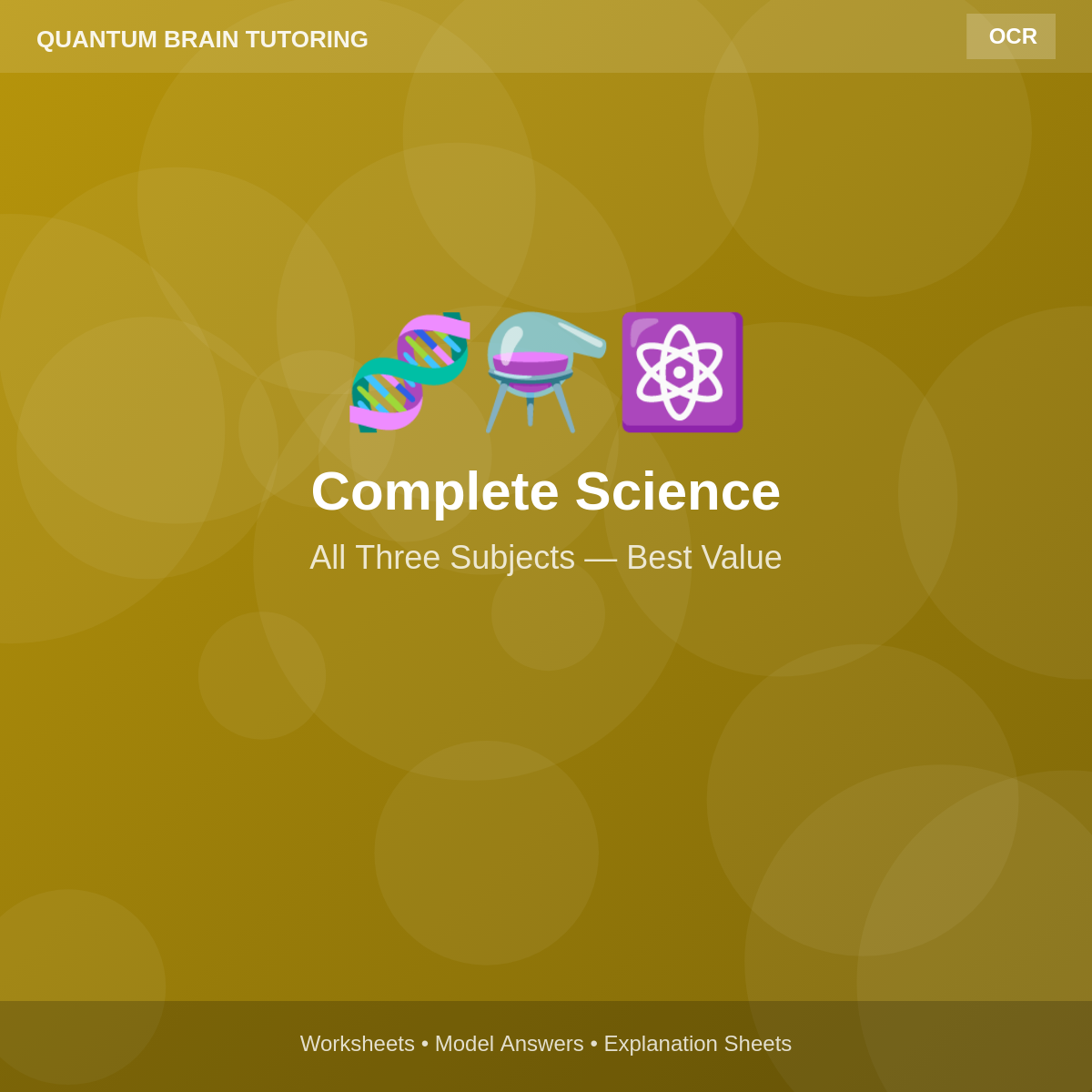The ultimate A-Level Science bundle for OCR students. Includes complete AS and A2 content for Biology, Chemistry, and Physics — worksheets, detailed answer sheets, and step-by-step explanation guides. Save over £14 compared to buying all three subjects separately.