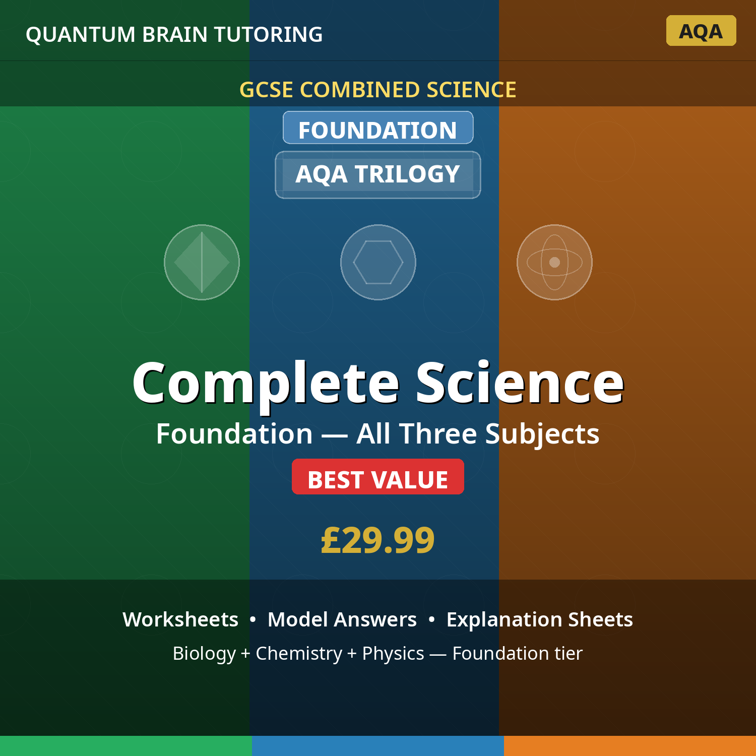 Complete triple bundle of GCSE Combined Foundation Biology, Chemistry, and Physics resources for AQA Trilogy exam board. Foundation tier content designed for students targeting grades 1-5.