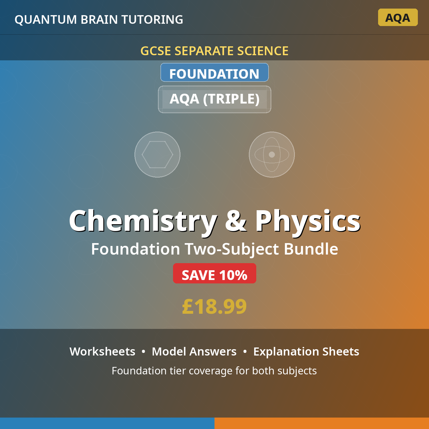 Double bundle of GCSE Foundation Chemistry and Physics resources for AQA (Triple) exam board. Includes worksheets, model answers, and explanation sheets with embedded diagrams for all topics in both subjects. Foundation tier content designed for students targeting grades 1-5.