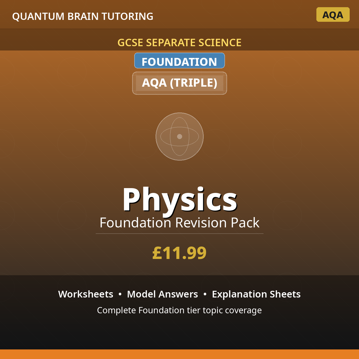 Complete GCSE Foundation Physics resource pack for AQA (Triple) exam board. Includes worksheets, model answers, and explanation sheets with embedded diagrams for all topics. Foundation tier content designed for students targeting grades 1-5.